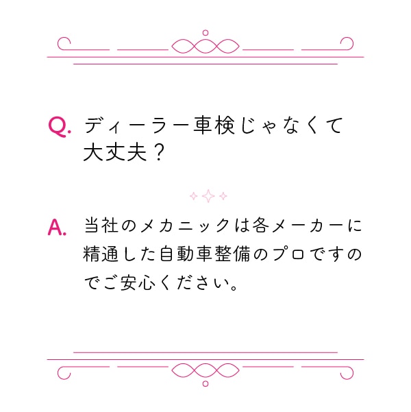 「確かな整備」をモットーに、整備品質の維持には万全を期しておりますが、万一当店の責任による不具合が発生した場合は、保証条件に従い整備保証をいたします。