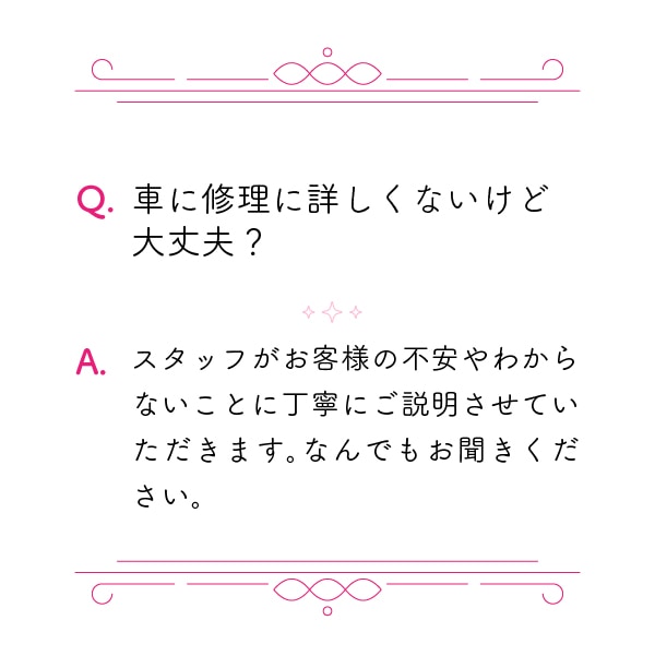 国家資格の自動車整備士1級を持った整備しが常駐しています。また、ディーラー出身も電装関係者も多数在籍しているので、あなたの愛車を丁寧・安心・安全にお取扱いいたします。